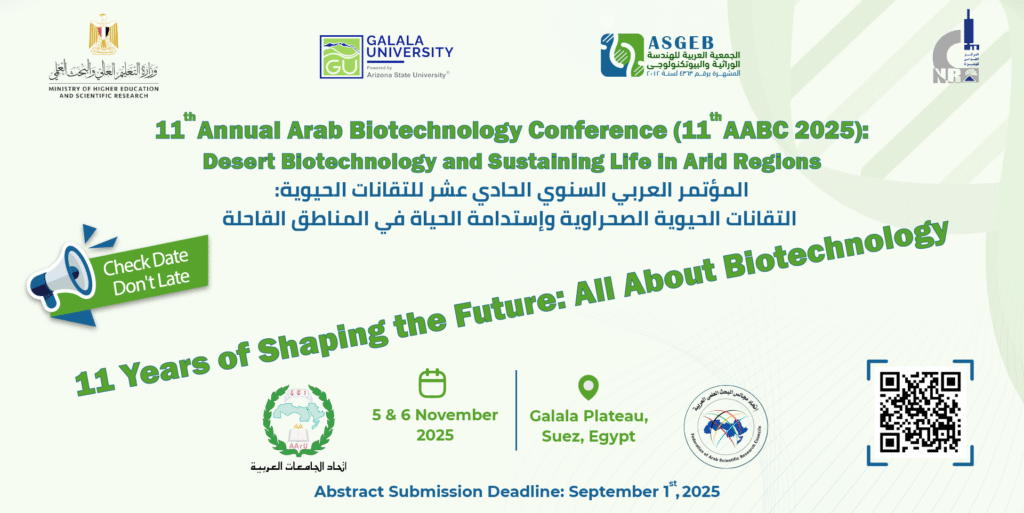 The Arab Society for Genetic Engineering and Biotechnology (ASGEB), in partnership with the National Research Centre (Egypt) and Galala University (Egypt), and in collaboration with the Arab Federation for Scientific Research Councils (FASRC) and the Association of Arab Universities (AAU), is proud to announce the 11th Annual Arab Biotechnology Conference.
