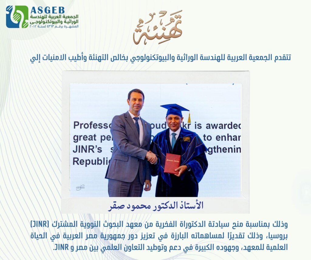 The Joint Institute for Nuclear Research (JINR), based in the Russian Federation, has awarded an Honorary Doctorate to Professor Mahmoud Sakr in recognition of his substantial contributions to